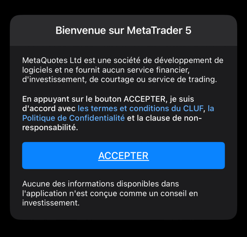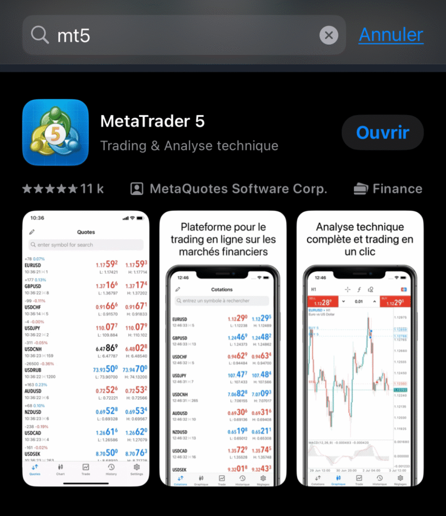 Rechercher « mt5 » puis installer l’application MetaTrader 5