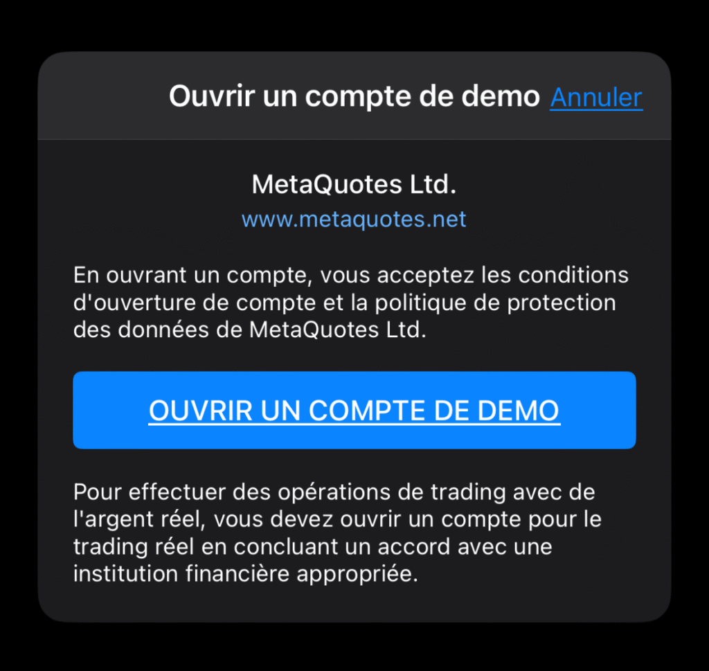 Par défaut, l’application vous propose d’ouvrir un compte de démo : cliquez sur « Annuler »