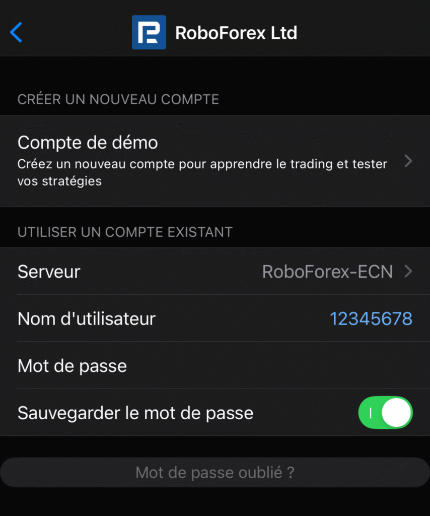 – Nom d’utilisateur : le numéro de votre compte de trading