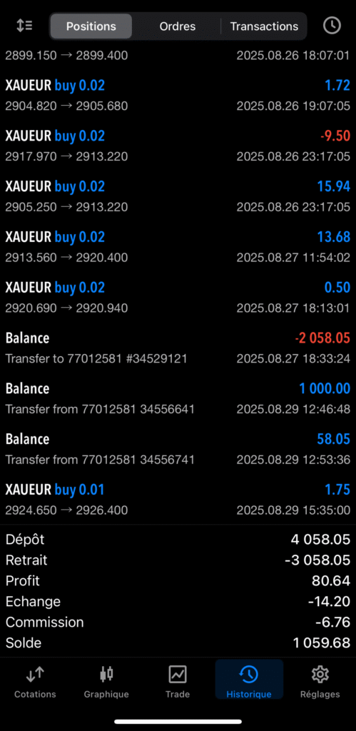 Historique : affiche l’historique des mouvements de votre compte de trading (gains, pertes, dépôts, retraits…)