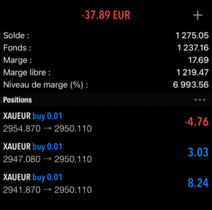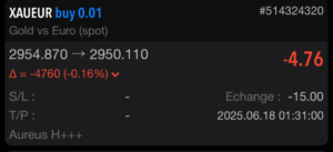 – le nom de l’actif financier (XAUEUR) suivi du type de position (« buy » = achat, « sell » = vente) et du volume (taille du lot) ouvert