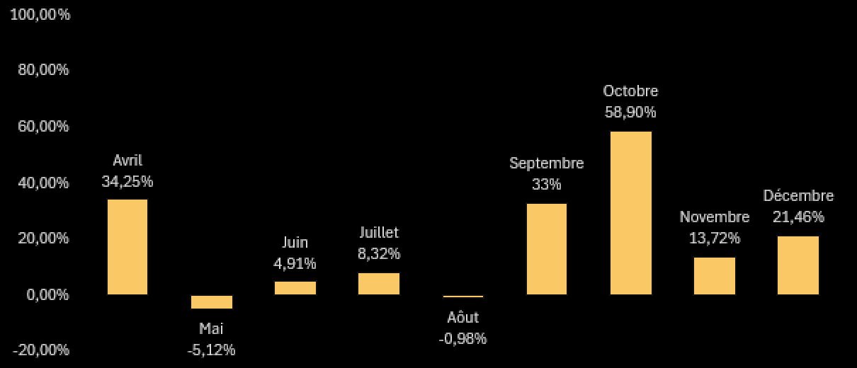 L'année 2025 est passée : l'heure est au bilan de cette première année de trading avec Aureus. Pour rappel, Aureus a commencé son activité le 31 mars 2025 et le bilan de ces 9 mois de trading sur l'Or est tout simplement excellent. En effet, le robot affichait au 31 décembre pas moins de 318% de profit grâce à l'effet des intérêts composés. Cela signifie qu'en plaçant 1 000€ le 31 Mars 2025, votre capital se porterait alors à 4180€ en fin d'année ! (hors commissions du robot)